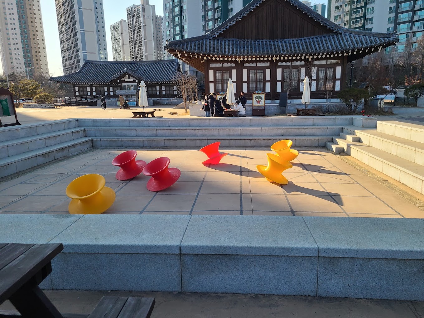 저렇게 아이들이 놀 수 있도록 팽이 의자가 배치되어있고 길 곳곳에 투호 같은 전통 놀이감도 있어서 아이들이 아주(사실 어른들도) 좋아합니다.